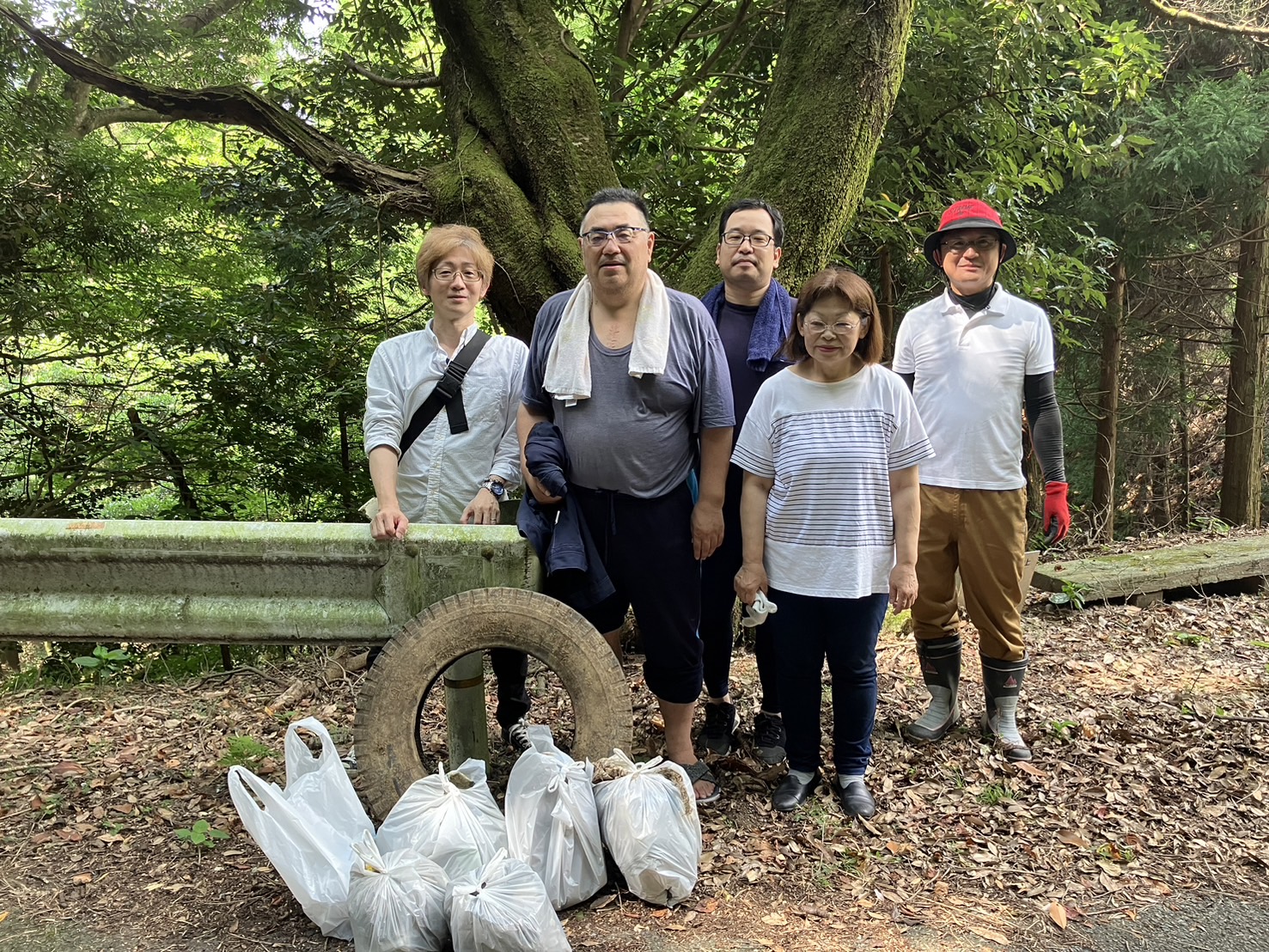 6名で40分程度で拾ったゴミは、ビニール袋6つとタイヤ1本でした。過去に何度もゴミを拾っている場所ですが、まだ多くのゴミが残っています。