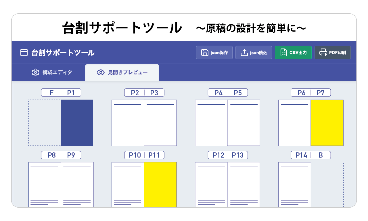 台割(ページ割)をブラウザ上で構成し、CSVやPDFで保存することができます。